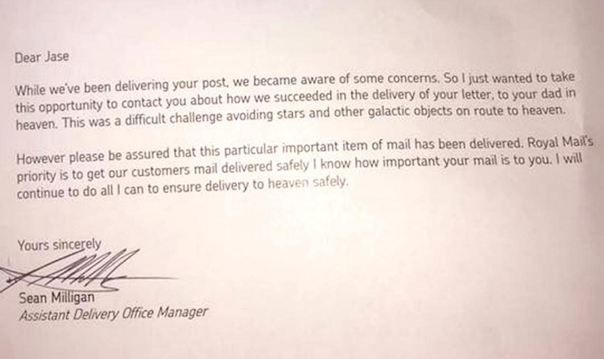 Jase recibió una carta desde el servicio postal, firmada por el jefe de entregas, quien le aseguraba que su saludo de cumpleaños había llegado con éxito a manos de su padre. "Sabemos lo importante que era esa postal para ti. Continuaremos haciendo lo posible para asegurar las entregas al cielo", afirmaron desde Royal Mail.