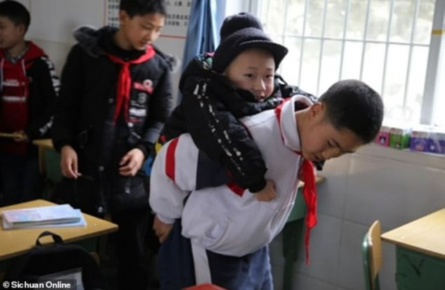 Un joven de 12 años y de origen chino ha conmovido a las redes sociales después de que trascendiera que el pequeño carga a sus espaldas todos los días con un amigo discapacitado para que éste pueda ir a la escuela.