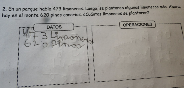 “En un parque había 473 limoneros. Luego se plantaron algunos limoneros más. Ahora hay en el monte 620 pinos canarios. ¿Cuántos limoneros se plantaron?”, reza el enunciado. “Soy incapaz de solucionar el problema y es de segundo de primaria”, escribió el hombre. “Si la solución es distinta a “algunos limoneros más” yo, no la encuentro…”, añadió.